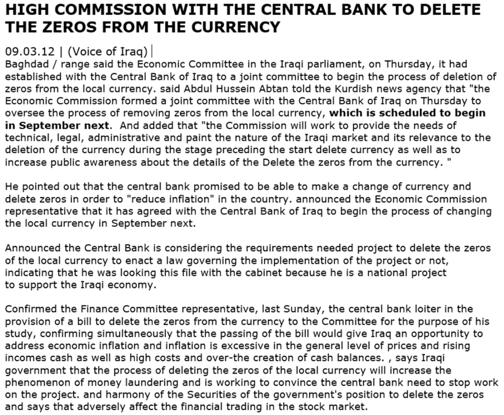 Did you read the article above from March 2012 on the removing of the zeros titled “HIGH COMMISSION WITH THE CENTRAL BANK TO DELETE THE ZEROS FROM THE CURRENCY”? It said and I quote “Baghdad / range said the Economic Committee in the Iraqi parliament, on Thursday, it had established with the Central Bank of Iraq to a joint committee to begin the process of deletion of zeros from the local currency. said Abdul Hussein Abtan told the Kurdish news agency that “the Economic Commission formed a joint committee with the Central Bank of Iraq on Thursday to oversee the process of removing zeros from the local currency” So this tells us the CBI in 2012 was not going to move ahead independently but wanted a joint commission with parliament. They plan to do the same now in 2025. This is what my CBI contact just told me yesterday. This is now what they are working on. This is the next step they are now in. Once this is completed they will aggressively move ahead. The clock is ticking. January 2026 is not that far off.