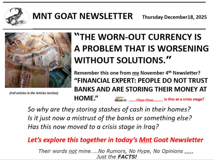 Then let’s tie this article to the article in my 11/20 Newsletter titled “IRAQ IS SET TO IMPLEMENT A NEW CURRENCY MECHANISM ON DECEMBER 1, 2025” . Do you remember it? Let’s take another look at now that we know much more since. But it did not get implemented on Dec 1st and so why? Could it be the elections and the issue with the Iranian militias? Remember once they implement this new currency mechanism there is no turning back. Everything must be in place for the financial entities to support it. My CBI contact has told me yesterday this date is now moved out until January 1, 2026. We should all understand why.