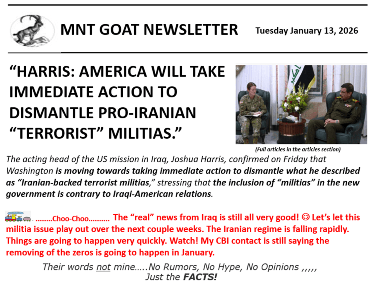 I want to emphasize once again not to get negative on the RV. It’s going to happen and has to happen. The current stalling of the event is almost solely due to what is happening in Iran. Iran will soon fall. It is coming and the writing is on the wall. Government officials in Iran have already made deals with the Russians to defect. These events in Iran will certainly affect the minds of the leaders of the militias in Iraq and bring them to second think about being disbanded. Many will simply go home back to Iran. Their arms will be under the control of the Iraqi forces. You might want to take a peek at yet another article on this subject matter titled “US CHARGÉ D’AFFAIRES: THE UNITED STATES EMPHASIZES THE NEED FOR IMMEDIATE ACTION TO DISMANTLE “MILITIAS” IN IRAQ”. 😊 Once again the US Embassy in Baghdad stated that the United States will continue to clearly emphasize the need for immediate action to dismantle militias in Iraq. We are NOT going to see the RV until this happens, says my contact in the CBI. You might also want to read a second article titled “HARRIS: AMERICA WILL TAKE IMMEDIATE ACTION TO DISMANTLE PRO-IRANIAN “TERRORIST” MILITIAS“. The acting head of the US mission in Iraq, Joshua Harris, confirmed on Friday that Washington is moving towards taking immediate action to dismantle what he described as “Iranian-backed terrorist militias,” stressing that the inclusion of “militias” in the new government is contrary to Iraqi-American relations.