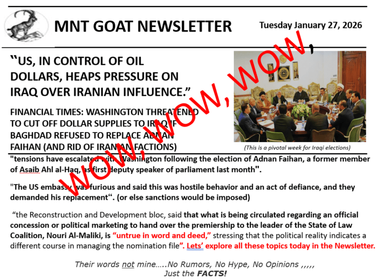 Remember the US has leverage over Iraq as they maintain control of over 100 billion dollars of Iraqi oil revenues in the banks in NYC. Oil is still mandated to be sold in US dollars even though we learned that the UN sanctions have been lifted since December 2022. So, I guess maintaining this leverage of not releasing these funds to Iraq was a good choice by the US? Can you imagine if the US were to cut of all dollars to Iraq? How would Iraq pay its bills as in the budget?