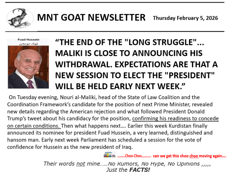 😊 In today’s news we should read the article titled “AL-MALIKI: TRUMP WAS MISLED ABOUT ME AND I AM READY TO WITHDRAW THE NOMINATION WITH A MAJORITY VOTE.” On Tuesday evening, Nouri al-Maliki, head of the State of Law Coalition and the Coordination Framework’s candidate for the position of next Prime Minister, revealed new details regarding the American rejection and what followed President Donald Trump’s tweet about his candidacy for the position, confirming his readiness to concede on certain conditions. Earlier in anther earlier article Maliki was noted as saying one condition was that he got to pick the nominee to replace him.