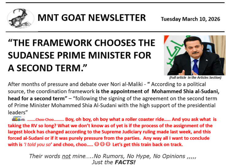 😊 😊 Do you remember the importance of the court’s ruling about the election from the Supreme Judiciary? I presented this article to you in my previous 3/3 Newsletter. Oh… this ruling is so important! Please remember it well! Let’s take a look at the very recent article titled “IRAQ WITHOUT A GOVERNMENT”: A LEGAL PROPOSAL THAT COULD BREAK THE POLITICAL DEADLOCK”. This article makes it VERY clear what is going to happen with this election to break the deadlock and why al-Sudani is going to be the nominee or should I say is now the nominee over al-Maliki. Yes, there is still a few objections to al-Sudani and some members of the Coordination Framework still believe they will get to pick another nominee over Maliki and not use al-Sudani. But they are wrong and this will not happen.