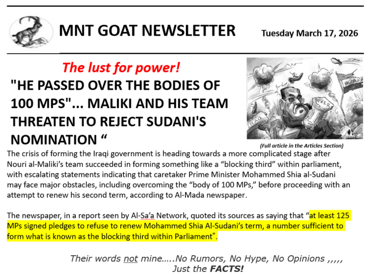 I want to quote from this article “The crisis of forming the Iraqi government is heading towards a more complicated stage after Nouri al-Maliki’s team succeeded in forming something like a “blocking third” within parliament, with escalating statements indicating that caretaker Prime Minister Mohammed Shia al-Sudani may face major obstacles, including overcoming the “body of 100 MPs,” before proceeding with an attempt to renew his second term, according to Al-Mada newspaper.” – “ The newspaper, in a report seen by Al-Sa’a Network, quoted its sources as saying that “at least 125 MPs signed pledges to refuse to renew Mohammed Shia Al-Sudani’s term, a number sufficient to form what is known as the blocking third within Parliament.”