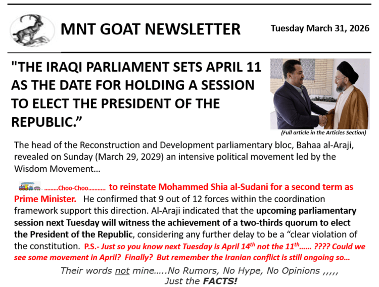 I know it seems like a long time since the elections were held in November 2025 and it has. Trust me when I say this to you that we are much, much better off waiting these past four plus months than to have Nori al-Maliki (peanut-head) as the prime minister. We would be waiting years more, at least with Maliki. I pray that this last go-around with Maliki awakened the citizens just how vulnerable the country really it to tyranny. It should also awaken them to the Iranian influence and what Iran had planned for Iraq. So, we may see the end to this election saga in the next few weeks however we still have issues with the Iranian militia and terrorist organizations in Iraq. These too must be addressed.
