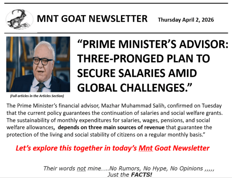 The second main article, thus issue in the news, is titled “PRIME MINISTER’S ADVISOR: THREE-PRONGED PLAN TO SECURE SALARIES AMID GLOBAL CHALLENGES”. The Prime Minister’s financial advisor, Mazhar Muhammad Salih, confirmed on Tuesday that the current policy guarantees the continuation of salaries and social welfare grants, while identifying three main sources to ensure the sustainability of salaries and social spending.