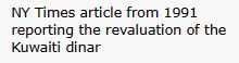 In February of 1991 Iraq was expelled from Kuwait, and a month later, the banks revalued their currency to $3.47, the highest valued currency in the world. When this occurred, the New York Times reported the event on March 25, 1991.