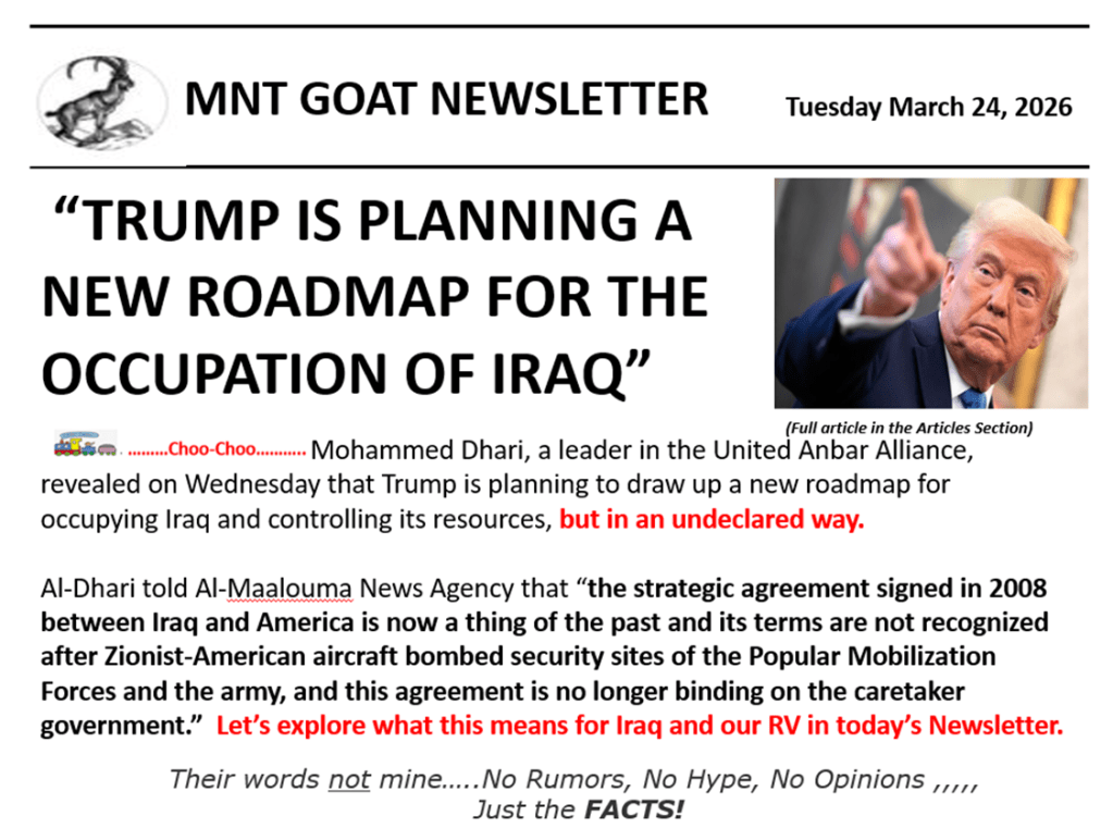 😊In the article titled ANBAR ALLIANCE: TRUMP IS PLANNING A NEW ROADMAP FOR THE OCCUPATION OF IRAQ Mohammed Dhari, a leader in the United Anbar Alliance, revealed on Wednesday that Trump is planning to draw up a new roadmap for occupying Iraq and controlling its resources, but in an undeclared way. Personally, I could not be happier of this move by the Trump administration. It is time to rid Iraq of the Iranian influence. This is how we are going to see the reinstatement. I know that many of the intel provider gurus tend to ignore this part of the holdup of the RV and instead dwell only on the reforms. In my presentation from my 03/13 Newsletter we can see how this emphasis was pushed, but nothing really happened as a result. It was an Iranian con-job on us investors to keep us complacent and quiet. Yes, to shut our mouths about what we were learning about what was really going on in Iraq, as we, more than most, dived into the details.