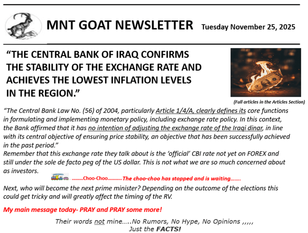 We as investors as well as the U.S. government under the Trump administration are waiting for the results of the election. I do not think they will come out with the prime minister until after US Special Envoy Mark Savaya’s visit. Al-Sudani has the BEST chance of having a second term. Since he moved his votes to the Coordination party his chances increased tremendously. This meeting is happening this week prior to Thanksgiving. So, if I hear any good news I will have a short Newsletter on Thursday to inform you of what news may come out of it. I will also have my normal Wednesday call to Iraq and so I will also let you know what my contact believes will happen next. Let’s pray it is what we want and the CBI can move ahead with the planned next phrase of the currency reform which is really a long awaited financial reform on steroids.