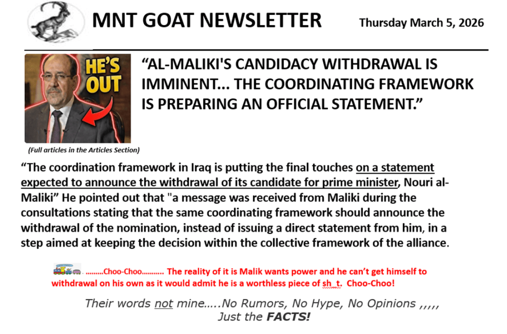 In a recent article titled “AL-MALIKI’S CANDIDACY WITHDRAWAL IS IMMINENT… THE COORDINATING FRAMEWORK IS PREPARING AN OFFICIAL STATEMENT” we learn that The coordination framework in Iraq is putting the final touches on a statement expected to announce the withdrawal of its candidate for prime minister, Nouri al-Maliki.